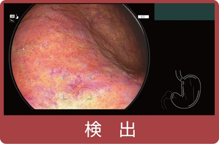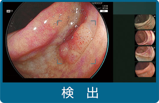 内視鏡検査時に癌やポリープなどが疑われる病変を検出すると、対象となるエリアを水色の検出ボックスで囲って、検出音とともにモニターに映し出すことで、医師の診断をサポートします。