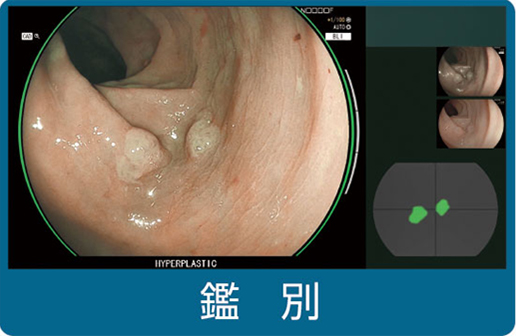 検出された病変が、腫瘍性あるいは非腫瘍性かを画像情報からリアルタイムに推定して、色でモニターに映し出すことで、医師の診断をサポートします。