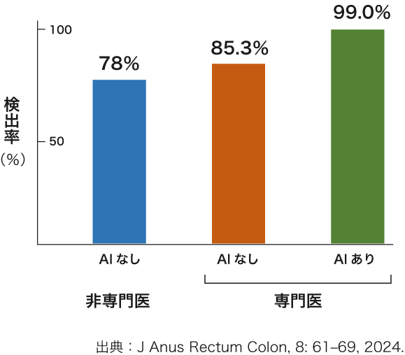 2024年に医学誌 J Anus Rectum Colon に掲載された研究では、大腸ポリープの検出率(ADR)について、AI併用により専門医による内視鏡診断能がさらに向上することが確認されました。